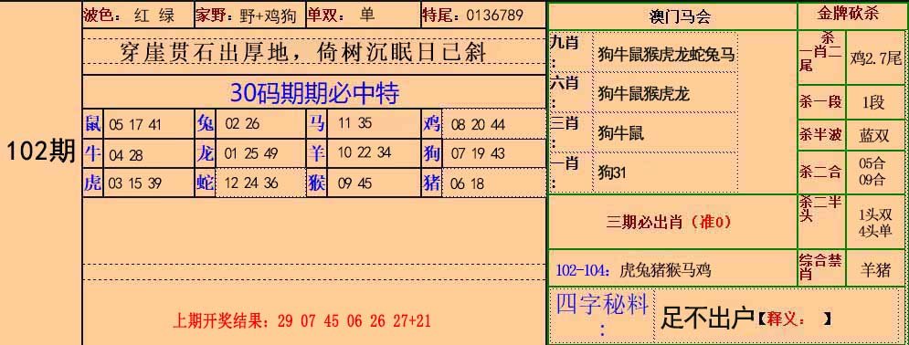 102期澳门关门联:取二合八有四五,狗牛鸡鼠是特码。解 [取] [6845]